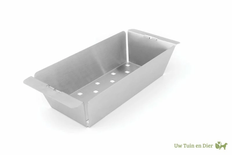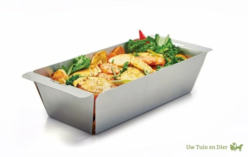 Een diepe roestvrije stalen smalle wok die ontworpen is om te passen in een Broil King-rooster segment. De 69722-bakplaat kan als deksel hierop worden geklikt.