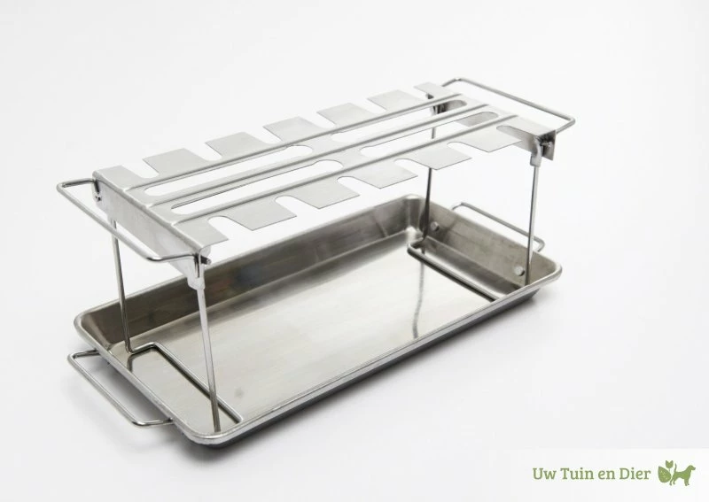 De constructie bestaat uit een roestvrijstalen schaal en het eigenlijke vleugelrek. De stukjes kip worden in het rek gehangen en komen niet in contact met het grilloppervlak, waardoor opflakkeringen en plakken van kip worden voorkomen.