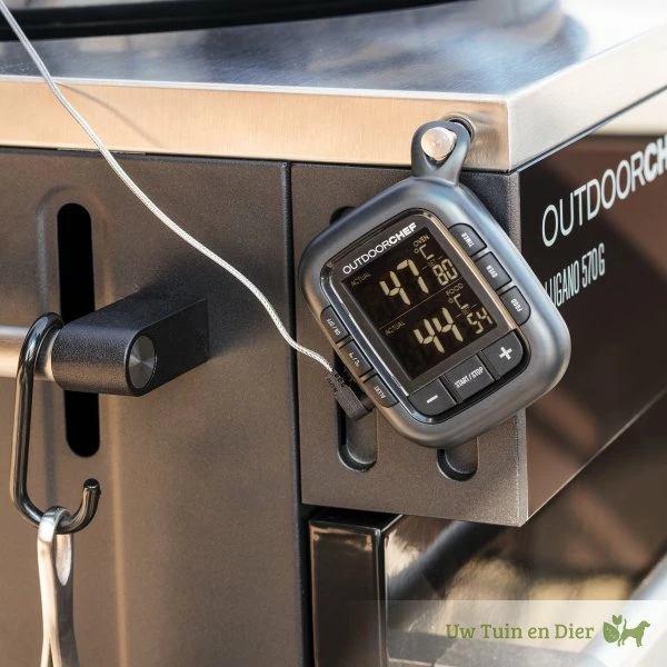 De Outdoorchef vleesthermometer Gourmet Check meet de kerntemperatuur van het vlees en de temperatuur van de omgeving. Het meetbereik loopt van 30 tot maar liefst 300 graden Celcius en is geschikt voor zowel barbecues als ovens. Door het grote LCD-display is de temperatuur zeer duidelijk af te lezen, bovendien is hij voorzien van een timerfunctie en een geluidssignaal.