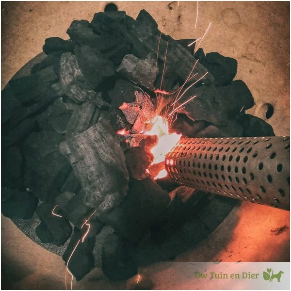 Voeg de aanstekerbrander toe aan de houtskool en zet hem aan. Slechts enkele seconden nadat de eerste vonken verschijnen, verwijdert u de ontsteker ~ 5 cm van de houtskool en houdt u deze nog ongeveer 60 seconden aan.