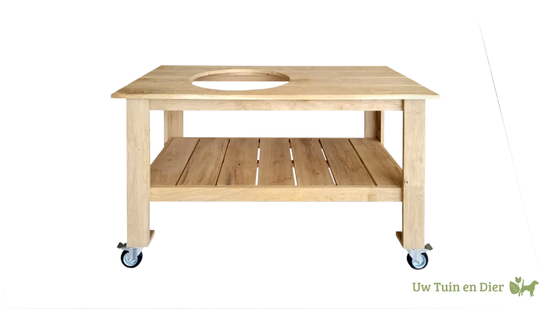 Deze robuuste eiken tafel is ontworpen om een ideale werkplek te creëren voor jouw Bastard Large. Met zijn breedte van 150cm heb je een extra ruimte om al jouw gerechten te verwerken of om alles netjes bij jouw kamado te plaatsen. Het enige wat je nog moet doen is een granieten tegel aanschaffen om onder de kamado te plaatsen, deze wordt niet meegeleverd